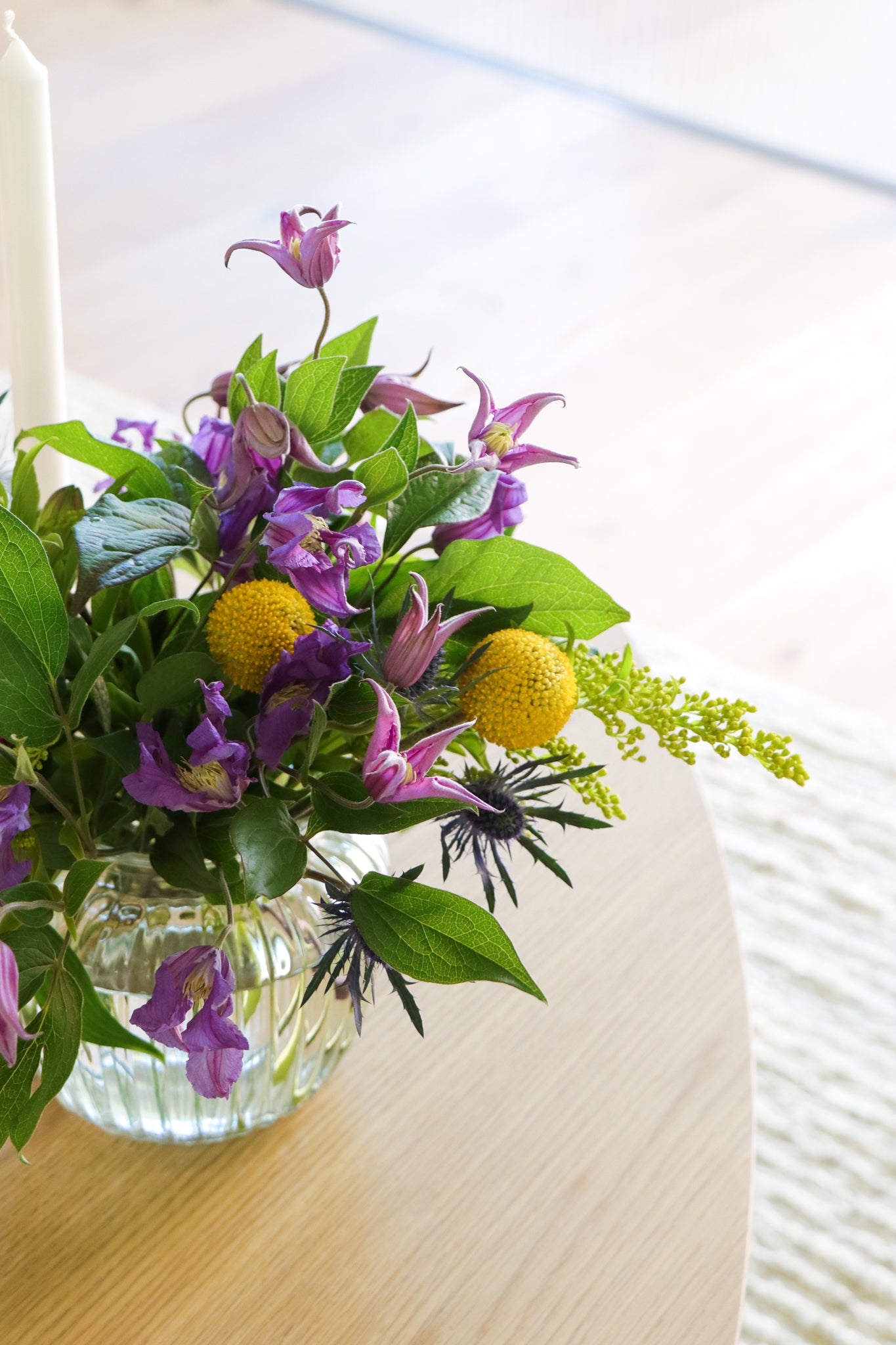 Pop your taller stems in the center and have your focal flowers arranged in a triangular fashion around the edge of the vase.